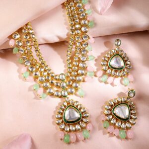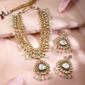 Necklace set: One of the most versatile forms of ornate designs that goes well with every style and personality. Wear one of these and you do not have to worry about any other accessory. Occasion : Bring your style to a whole new level with this handcrafted piece of jewellery. When you’re celebrating a special Occasion : – a birthday, wedding, or personal milestone – this piece adds that extra something that makes us feel special and looking our best. Material : & Care Dimension :Size : Necklace : 48 cm, Earrings : 7.5 cm Material :Brass Care Label : It is advisable to avoid contact with water and organic chemicals i.e. perfume sprays. Store jewellery in airtight box. After use, wipe the jewellery with soft cotton cloth.