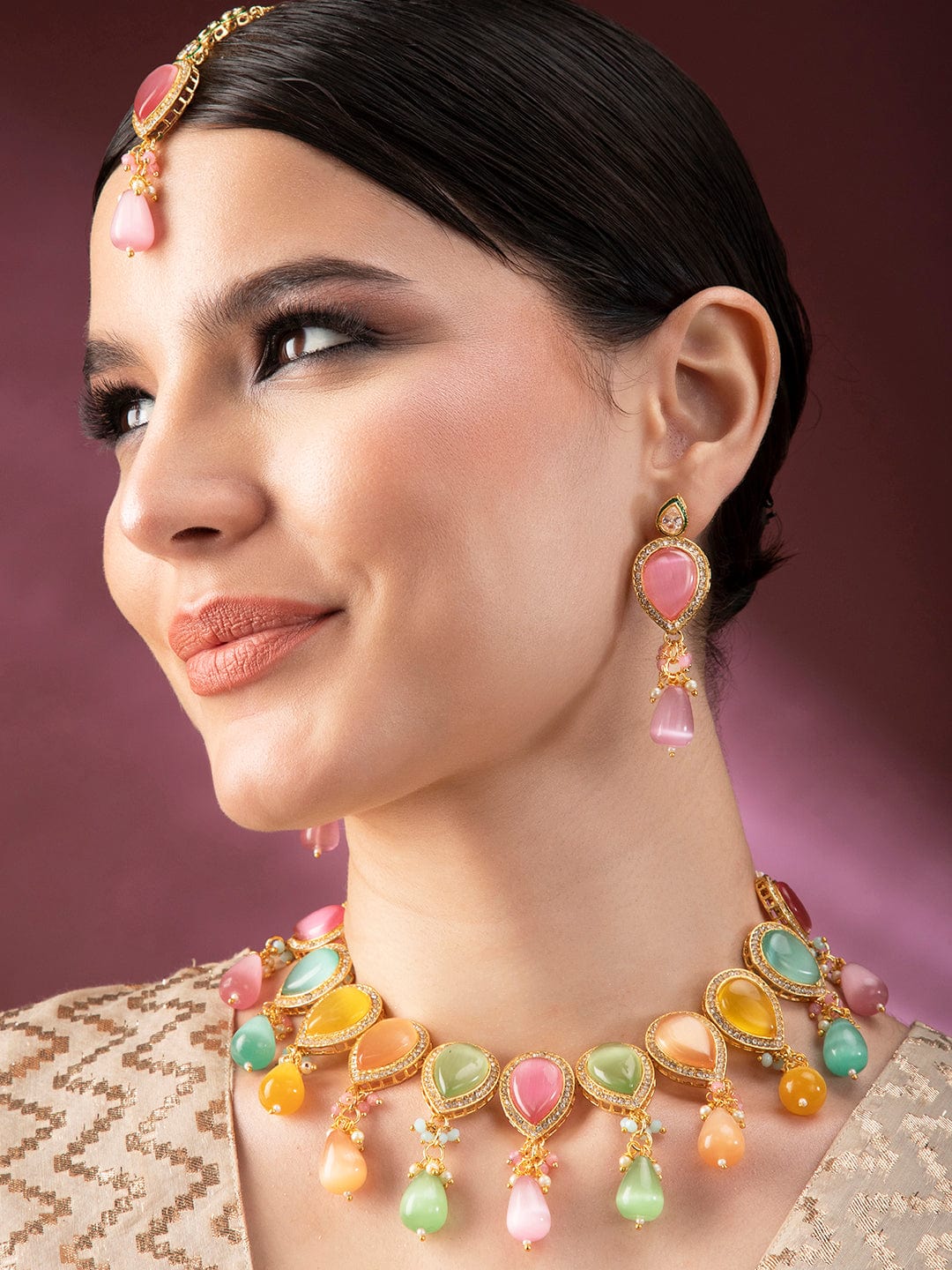 It’s a jewellery set fit for the queens! Exude the royal vibe with this stone studded jewellery set. Consisting of a necklace, matching earrings, this necklace set is crafted from gold-plated brass, stones and beads. Occasion : Bring your style to a whole new level with this handcrafted piece of jewellery. When you’re celebrating a special Occasion : – a birthday, wedding, or personal milestone – this piece adds that extra something that makes us feel special and looking our best. Material : & Care Dimension : Necklace – 21.4 cm ,Earrings- 6.2 cm , Maangtikka – 14.2 cm Collection : Kundan(Gold) Material: Brass Net Weight: 113 Gram Net Quantity: 1 Necklace, 1 Pair of Earrings, 1 Maang Tikka Care Label: It is advisable to avoid contact with water and organic chemicals i.e. perfume sprays. Store jewellery in airtight box. After use, wipe the jewellery with soft cotton cloth.