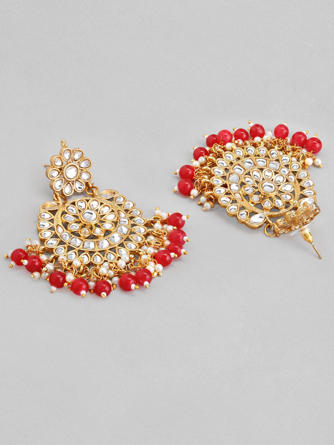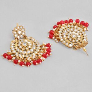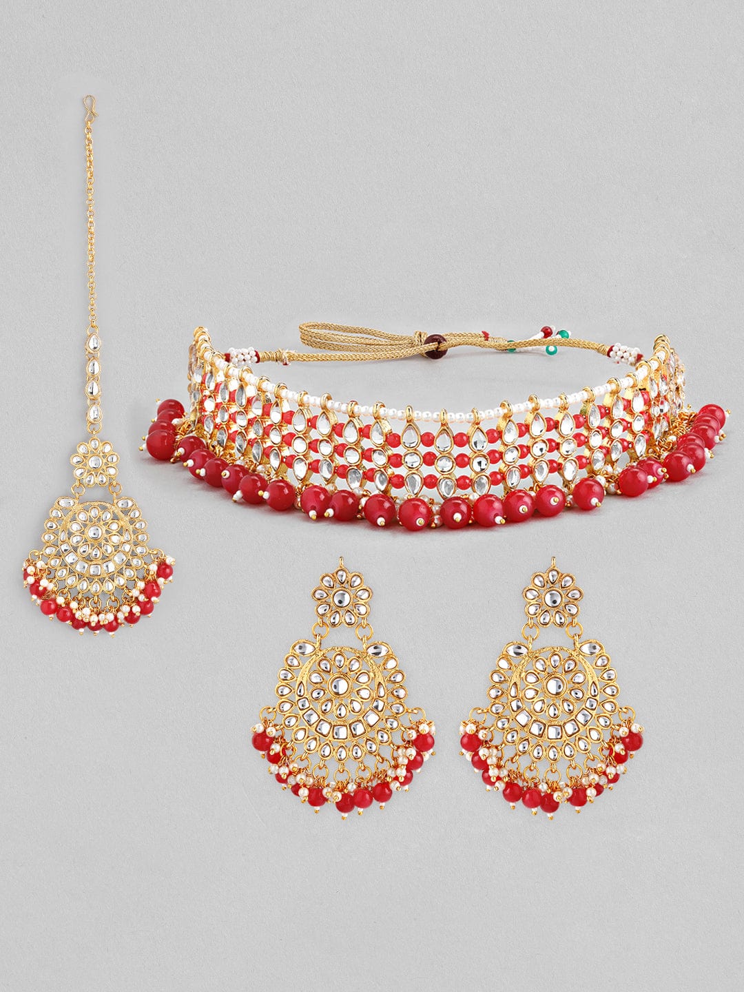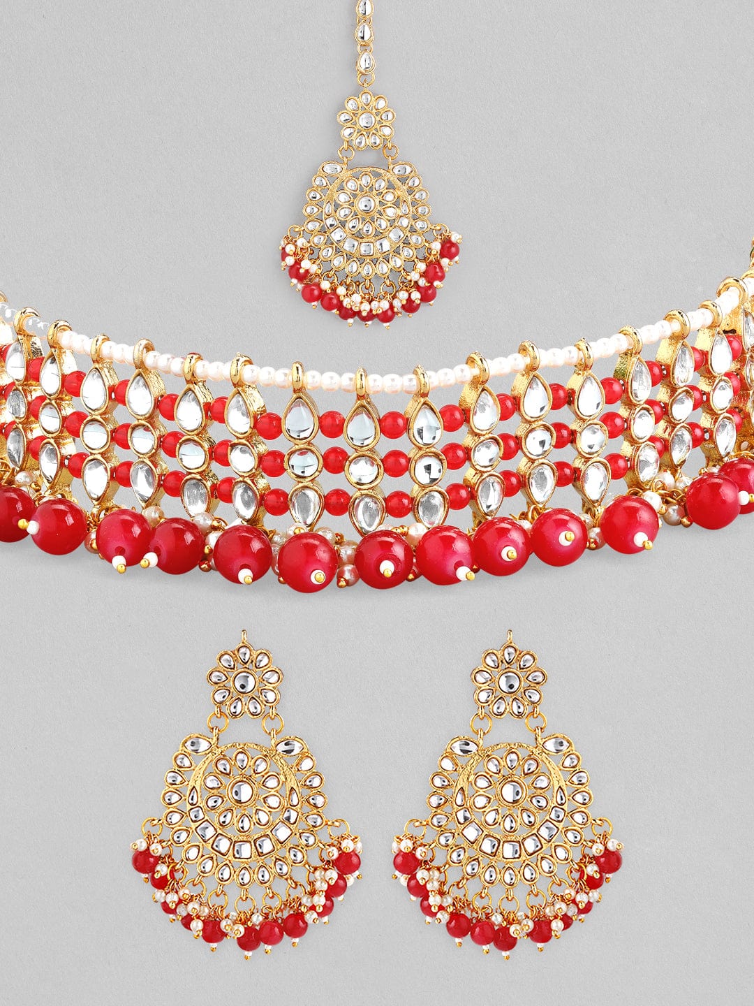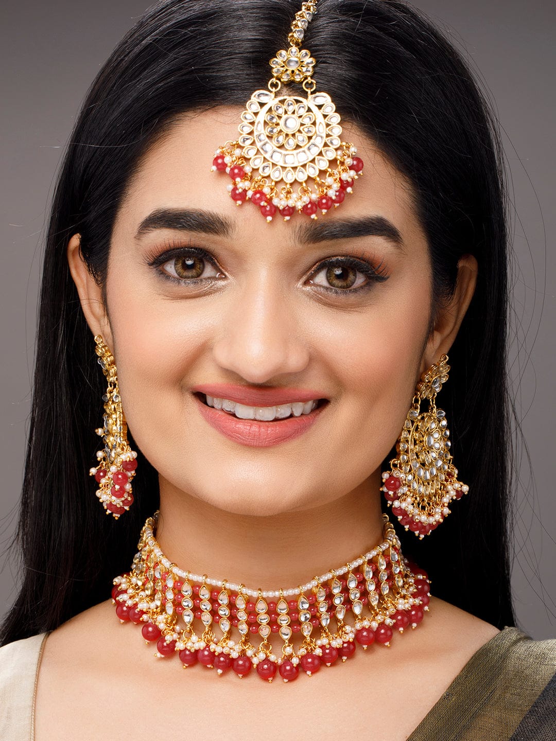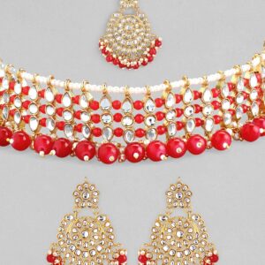 Necklace Set : This exquisite & is crafted from gold-toned material and showcases kundan studded details. The elegant red color adds a timeless touch, perfect for special occasions. Complete your look with this stunning piece. Occasion : Bring your style to a whole new level with this handcrafted piece of jewellery. When you’re celebrating a special Occasion : – a birthday, wedding, or personal milestone – this piece adds that extra something that makes us feel special and looking our best. Material : & Care Dimension : Length of the necklace: 26 cm Length of the earrings: 6 cm Length of the maang tikka: 18 cm Material: Brass Net Weight: 100 Gram Net Quantity: 1 Necklace, 1 Pair of Earrings, 1 Maang Tikka Care Label: It is advisable to avoid contact with water and organic chemicals i.e. perfume sprays. Store jewellery in airtight box. After use, wipe the jewellery with soft cotton cloth.