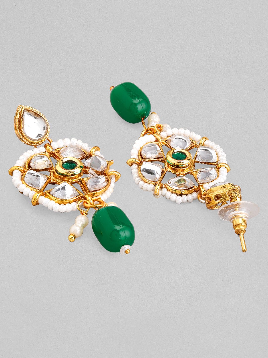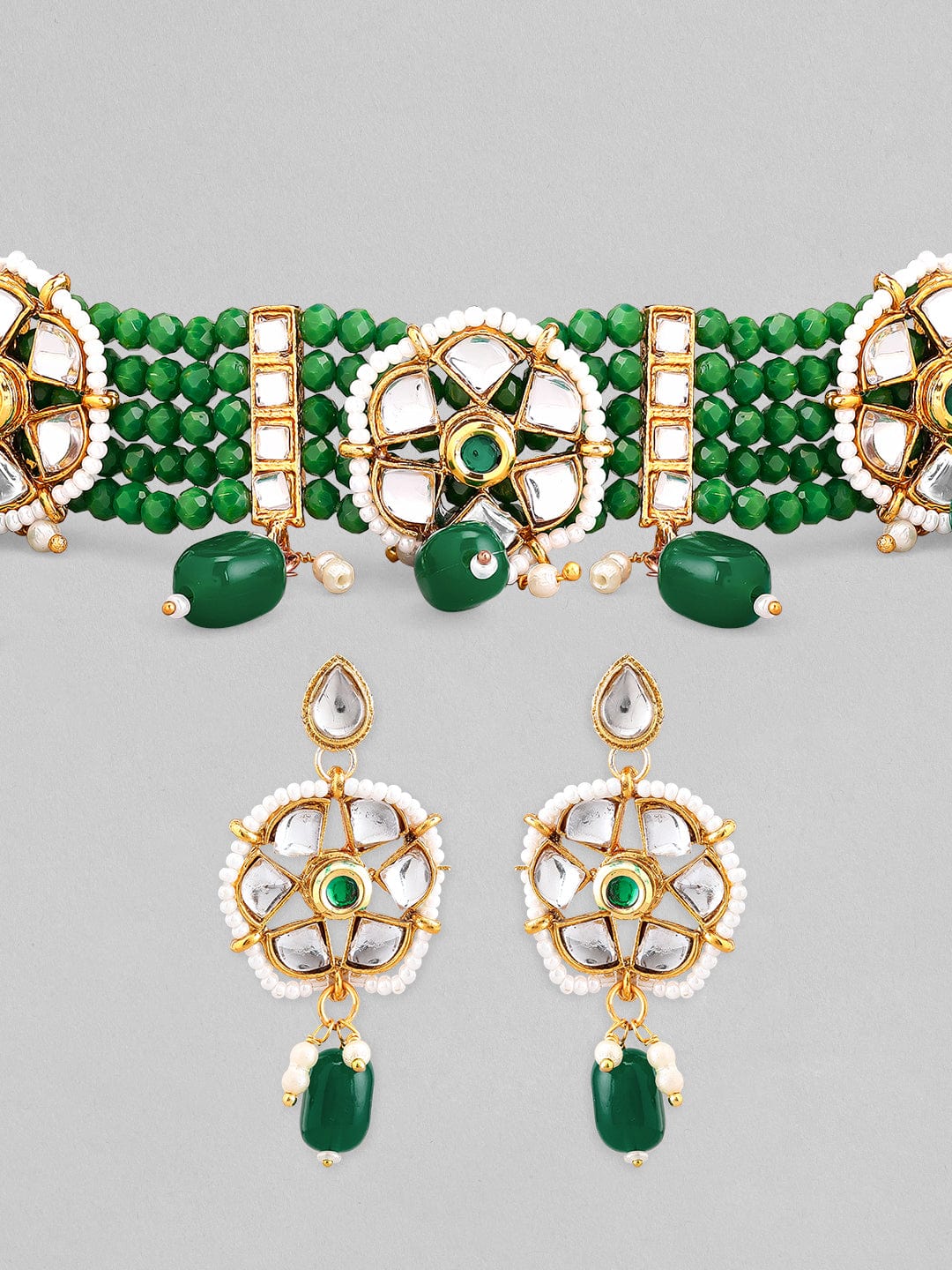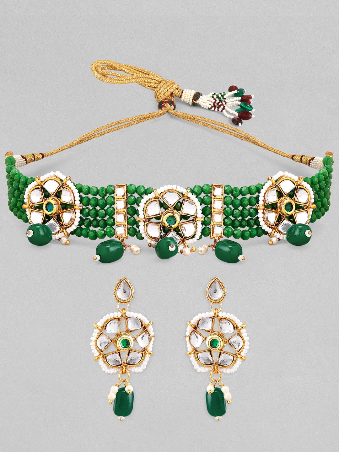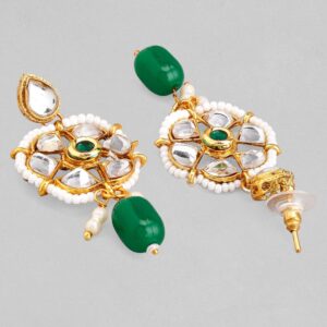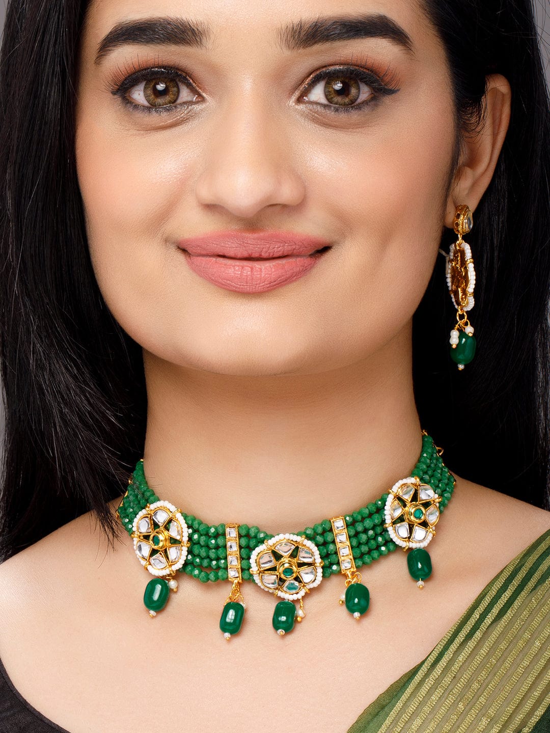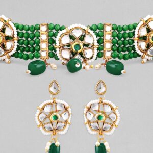 Necklace Set : This exquisite white is crafted from gold-toned material and showcases green beaded details. The elegant kundan-studded color adds a timeless touch, perfect for special occasions. Complete your look with this stunning piece. Occasion : Bring your style to a whole new level with this handcrafted piece of jewellery. When you’re celebrating a special Occasion : – a birthday, wedding, or personal milestone – this piece adds that extra something that makes us feel special and looking our best. Material : & Care Dimension : Length of the Necklace : 28 cm Length of the Earring: 6 cm each Material: Brass Net Weight: 50 Gram Net Quantity: 1 Necklace & 1 Pair of Earrings Care Label: It is advisable to avoid contact with water and organic chemicals i.e. perfume sprays. Store jewellery in airtight box. After use, wipe the jewellery with soft cotton cloth.