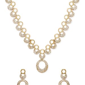 Illuminate your style with our resplendent gold-plated AD necklace set. Crafted with precision and adorned with sparkling stones, this set embodies timeless elegance and sophistication. Elevate any occasion with this exquisite jewelry, a dazzling addition to your collection. Material & Care Dimension : Necklace : 14 cm Earrings : 1.5 cm Material: Brass Net Weight: 24.65 Gram Net Quantity: 1 Necklace & 1 Pair of Earrings Care Label: It is advisable to avoid contact with water and organic chemicals i.e. perfume sprays. Store jewellery in airtight box. After use, wipe the jewellery with soft cotton cloth.