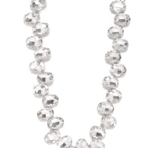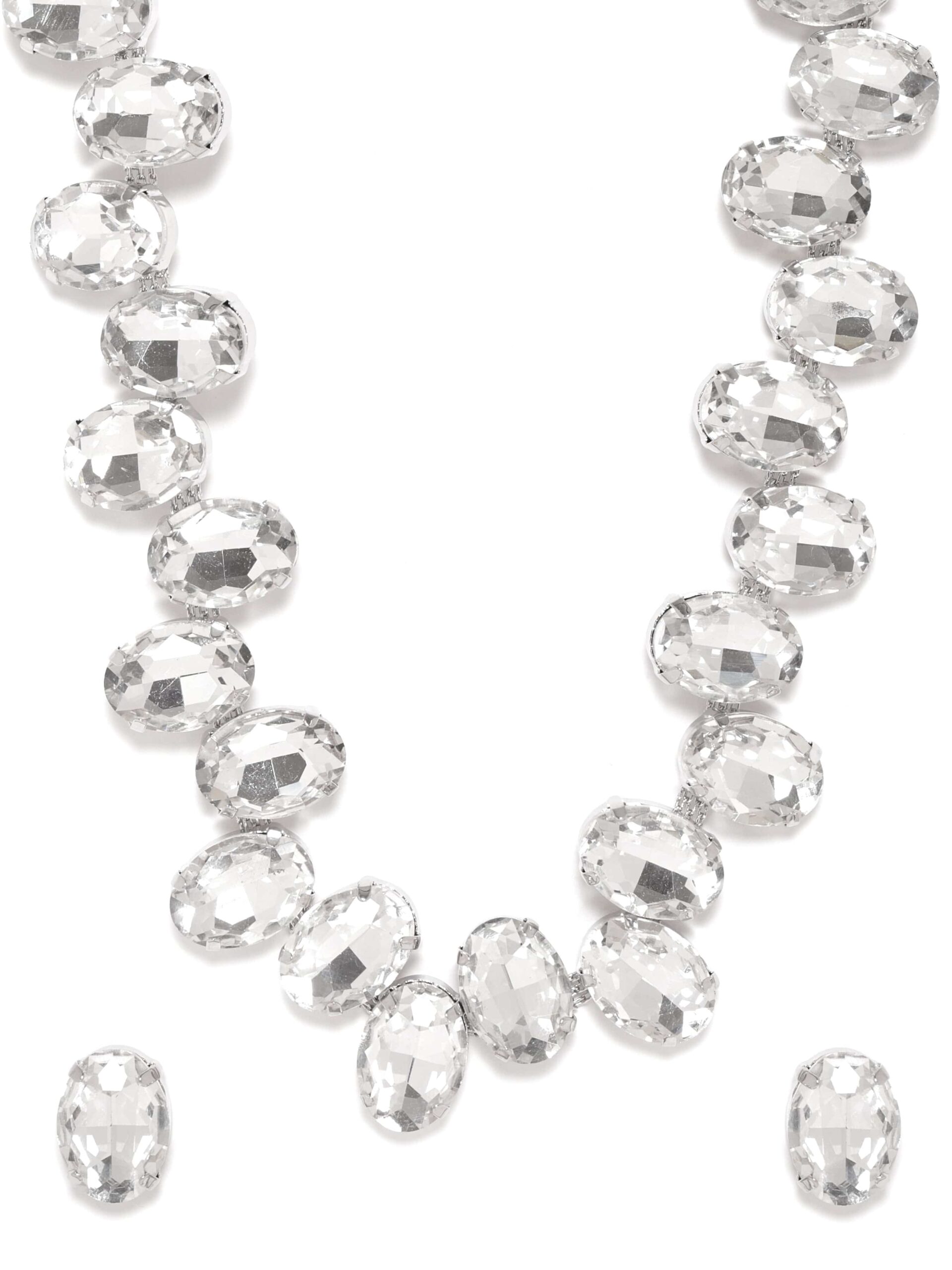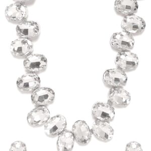 The centerpiece of this set is a statement necklace adorned with an array of white gemstones, each carefully chosen for its pristine elegance. The intricate metalwork that cradles these stones adds a touch of rustic allure to the design, reminiscent of the rugged spirit of the frontier. Material & Care Dimension : Necklace Length: 20 cm Earrings Length: 2 cm Material : Brass Net Weight : 87.41g Net Qty : 1 Necklace, 1 Pair of Earrings, Care Label : It is advisable to avoid contact with water and organic chemicals i.e. perfume sprays. Store jewellery in airtight box. After use, wipe the jewellery with soft cotton cloth.