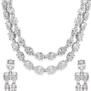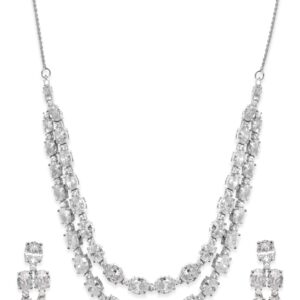 it’s a jewellery set fit for the queens! Exude the royal vibe with this stone studded jewellery set. Consisting of a necklace, matching earrings, this necklace set is crafted from gold-plated brass, stones and beads. Occasion : Bring your style to a whole new level with this handcrafted piece of jewellery. When you’re celebrating a special Occasion : – a birthday, wedding, or personal milestone – this piece adds that extra something that makes us feel special and looking our best. Material : & Care Dimension : Necklace: 45 cm; Earrings: 4 cm Collection : AD(Silver) Material: Brass Net Weight: 55 Gram Net Quantity: 1 Necklace & 1 Pair of Earrings Care Label: It is advisable to avoid contact with water and organic chemicals i.e. perfume sprays. Store jewellery in airtight box. After use, wipe the jewellery with soft cotton cloth.