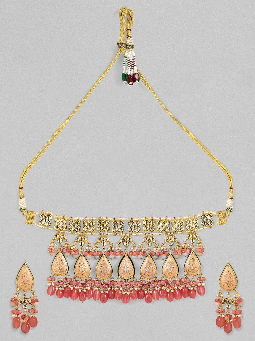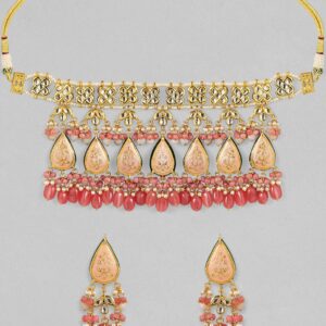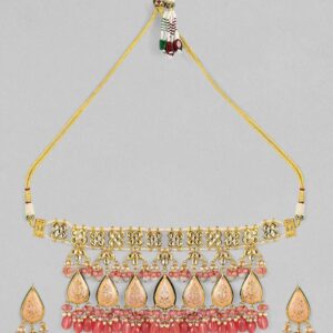 This bold statement piece features magnificent pink Enamel drop-shaped motifs enhanced with pachi kundans. All elements of this 24k gold plated necklace are meticulously put together to curate a one-of-a-kind piece. The simple band on the top followed by motifs studded with pearls and pink beads make this necklace unique. It comes with designer drop earrings having a related design. Occasion – Medium to heavy Indian events and festivals are ideal to style this necklace set. Material : & Care Dimension : Necklace: 32 cm; Earrings: 7.5 cm Material : Brass Net Quantity : 1 Necklace and 1Pair of Earrings Care Label : It is advisable to avoid contact with water and organic chemicals i.e. perfume sprays. Store jewellery in airtight box. After use, wipe the jewellery with soft cotton cloth