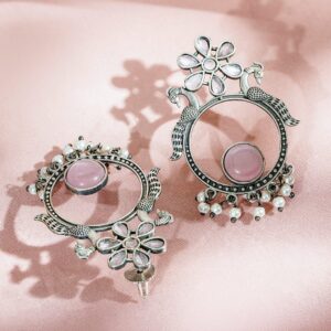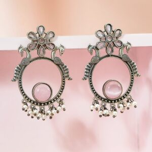 Earrings : Crafted in brass, these oxidised earrings feature a peacock-circle motif with pastel pink stones, floral accents, and pearl beads—perfect for weddings, festive looks, or gifting moments. Ideal Ethnic Gift Pick: A beautiful accessory for women & girls on birthdays, weddings, pujas, and festive celebrations—elegantly packed for gifting with an artistic, timeless feel. Material & Care Dimension : Length: 5 cm ; Width : 3 cm Material : Brass Weight: 13.02 gram Net Quantity : 1 Pair of Earrings Collection : Oxidized Care Label : It is advisable to avoid contact with water and organic chemicals i.e. perfume sprays. Store jewelry in airtight box. After use, wipe the jewellery with soft cotton cloth.