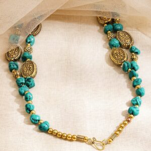 This dual-layer oxidized necklace features turquoise blue raw stone beads paired with antique gold oval tribal discs. A handcrafted bohemian piece ideal for artistic and ethnic dressing. Material & Care Dimension : Necklace : 35 cm ; Width : 2 cm Material: Brass Collection : Beaded Net Weight: 100.83 gram Net Quantity: 1 Necklace Care Label: It is advisable to avoid contact with water and organic chemicals i.e. perfume sprays. Store jewellery in airtight box. After use, wipe the jewellery with soft cotton cloth.