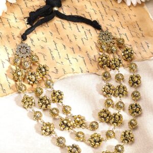Necklace : Crafted in oxidized antique gold-plated brass, this triple-layered necklace features floral motif beads and carved accents—perfect for enhancing festive and traditional looks with statement charm. Perfect for Festive and Cultural Events: Ideal for weddings, festivals, and traditional gatherings, this necklace enhances both sarees and fusion wear effortlessly. Material & Care Material : Brass Size & Fit : Length : 30 cm ; Width : 3 cm Net Weight : 52.78 Gram Plating : Antique Gold-Plated Stone Type : Artificial Beads Net Quantity : 1 Necklace Care Label : It is advisable to avoid contact with water and organic chemicals i.e. perfume sprays. Store jewellery in airtight box. After use, wipe the jewellery with soft cotton cloth.
