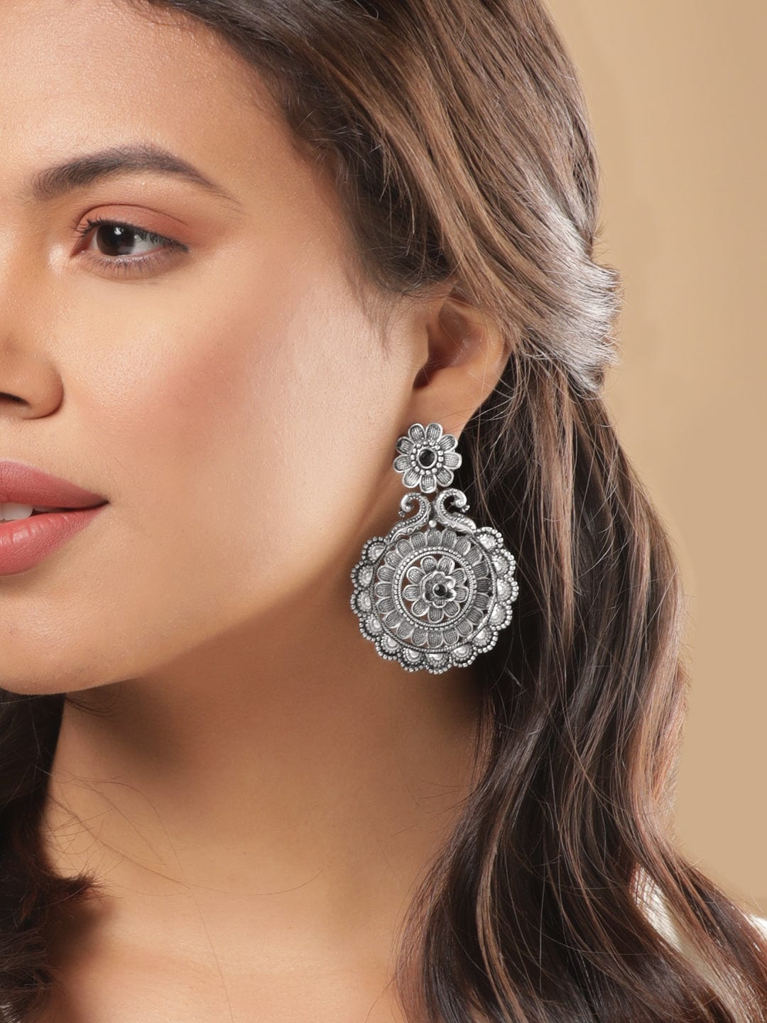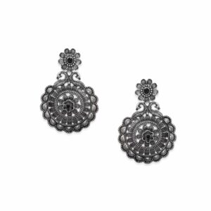 These exquisite earrings showcase intricate designs and a beautifully oxidised finish, evoking a sense of vintage allure. The chandelier-style silhouette adds a touch of grandeur, while the oxidised detailing enhances the intricate patterns. With their captivating beauty and old-world charm, these earrings are the perfect accessory to make a statement and add a touch of elegance to any ensemble. Occasion : Bring your style to a whole new level with this handcrafted piece of jewellery. When you’re celebrating a special Occasion : – a birthday, wedding, or personal milestone – this piece adds that extra something that makes us feel special and looking our best. Material & Care Length : 7 cm Material : Alloy Care Label : It is advisable to avoid contact with water and organic chemicals i.e. perfume sprays. Store jewellery in airtight box. After use, wipe the jewellery with soft cotton cloth.
