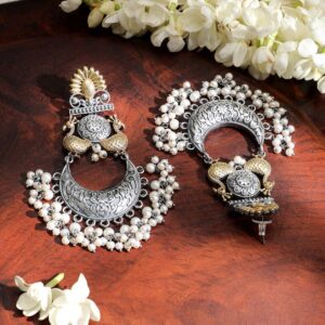 intricately crafted dual-tone chandelier earrings feature oxidized silver and gold plating with a detailed peacock motif and pearl-like drops. A statement of elegance and heritage. Occasion : Bring your style to a whole new level with this handcrafted piece of jewelry. When you’re celebrating a special Occasion : – a birthday, festive, wedding, or personal milestone – this piece adds that extra something that makes us feel special and looking our best. Material & Care Dimension : Length: 7.5 cm ; Width : 4.5 cm Material : Brass Weight: 46.01 gram Net Quantity : 1 Pair of Earrings Care Label : It is advisable to avoid contact with water and organic chemicals i.e. perfume sprays. Store jewelry in airtight box. After use, wipe the jewellery with soft cotton cloth.
