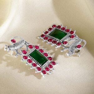 Be the first to review “Oxidized Silver Plated Emerald, Ruby & Zirconia Studded Tiger Motif Statement Drop Earrings – Silver”