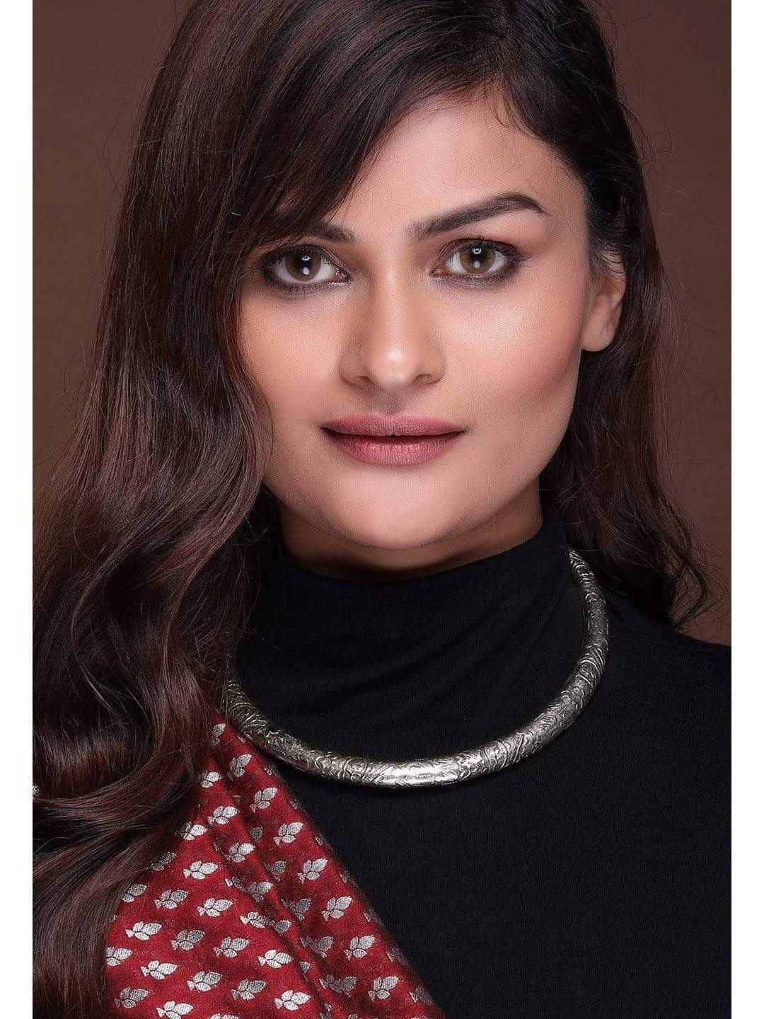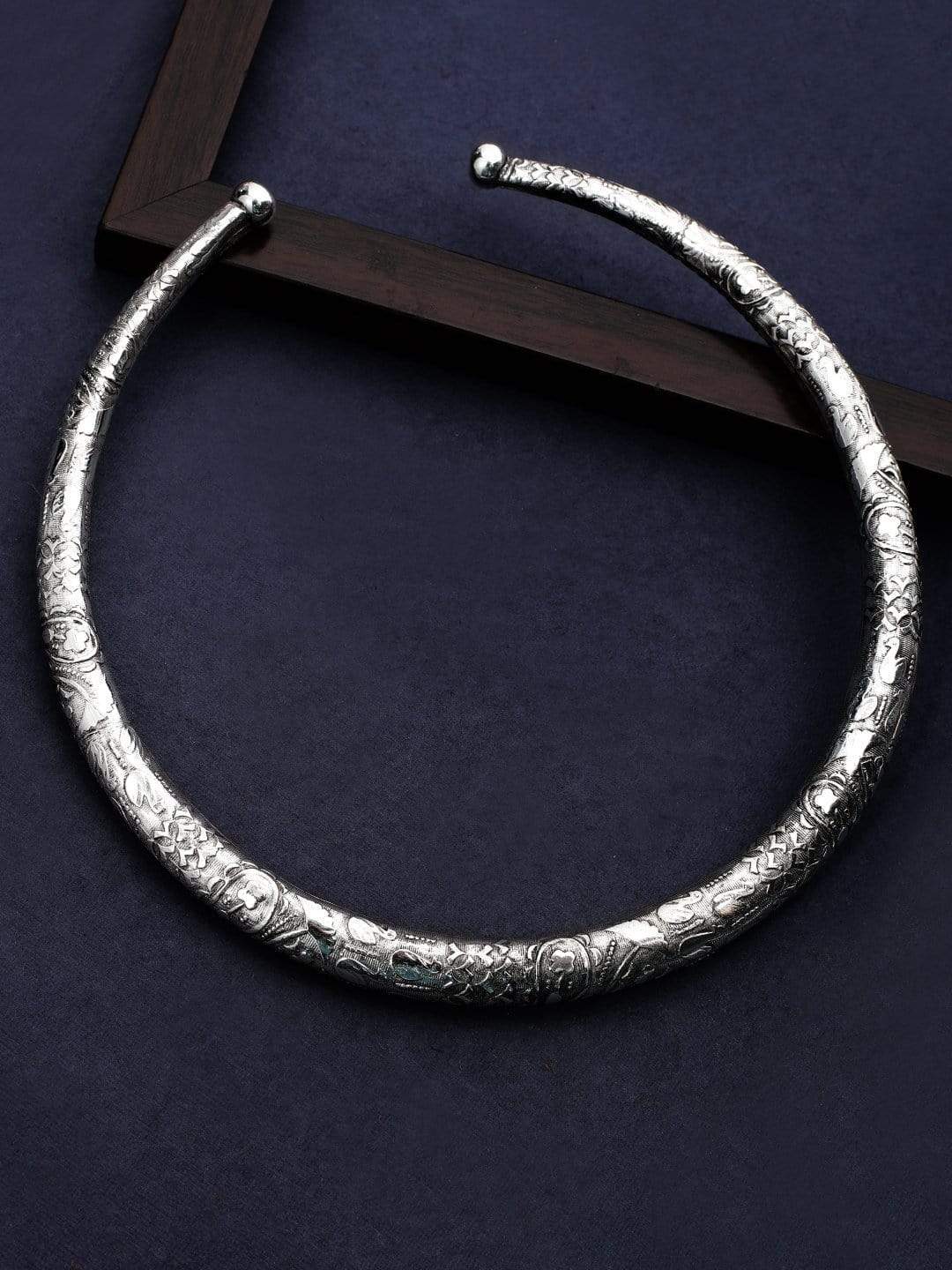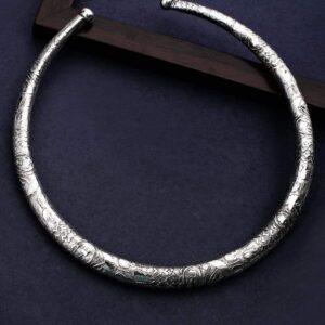 This oxidized silver-plated choker necklace features a stunning floral and geometric design, blending tradition with modern style. A perfect statement piece for enhancing any attire with elegance. Occasion : Bring your style to a whole new level with this handcrafted piece of jewellery. When you’re celebrating a special Occasion : – a birthday, wedding, festive or personal milestone – this piece adds that extra something that makes us feel special and looking our best. Material & Care Dimension : Necklace 42 cm, Material : Brass Net Quantity: 1 Necklace & 1 Pair of Earrings Care Label : It is advisable to avoid contact with water and organic chemicals i.e. perfume sprays. Store jewellery in airtight box. After use, wipe the jewellery with soft cotton cloth.