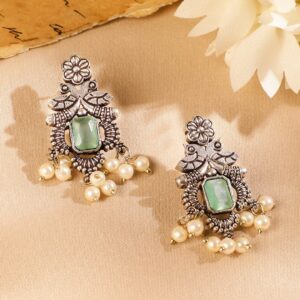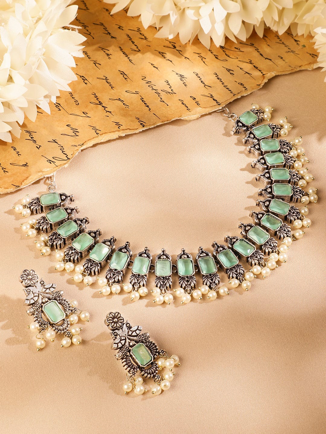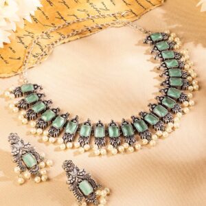 Jewellery Set : This oxidized silver-plated necklace set features pastel mint green stones, intricate motifs, and pearl bead detailing—perfect for festive, party, or cultural occasions for women. Material & Care Length : Necklace : 20 cm ; Earrings : 4 cm Width : Necklace : 3 cm ; Earrings : 2 cm Material: Brass Net Weight : 58.37 Gram Net Quantity : 1 Necklace and 1 Pair of Earrings Collections : Oxidized Care Instruction : Wipe your jewellery with a soft cloth after every use. Always store your jewellery in a flat box to avoid accidental scratches. Keep sprays and perfumes away from your jewellery. Do not soak your jewellery in water. Clean your jewellery using a soft brush, dipped in jewellery cleaning solution only