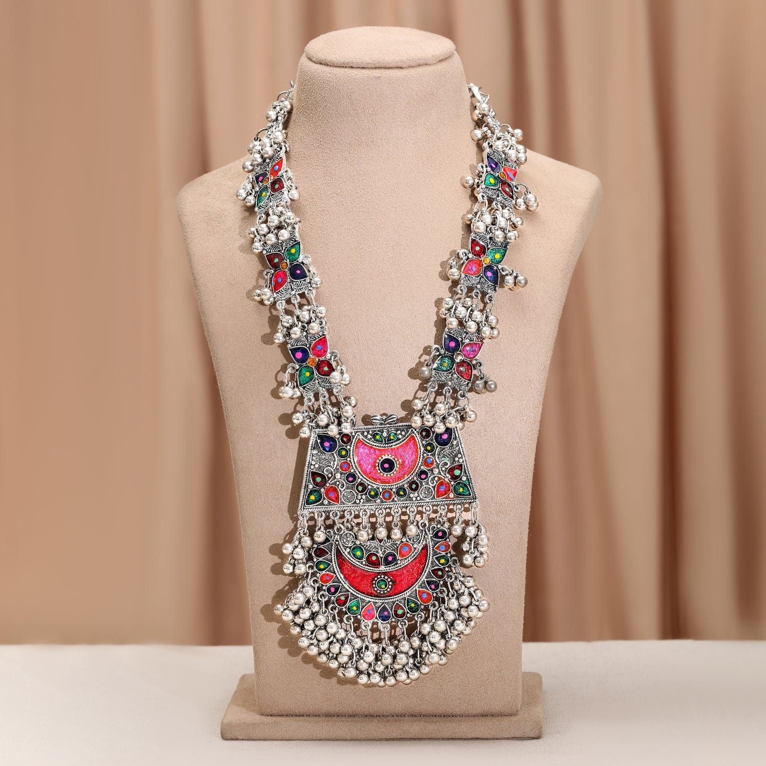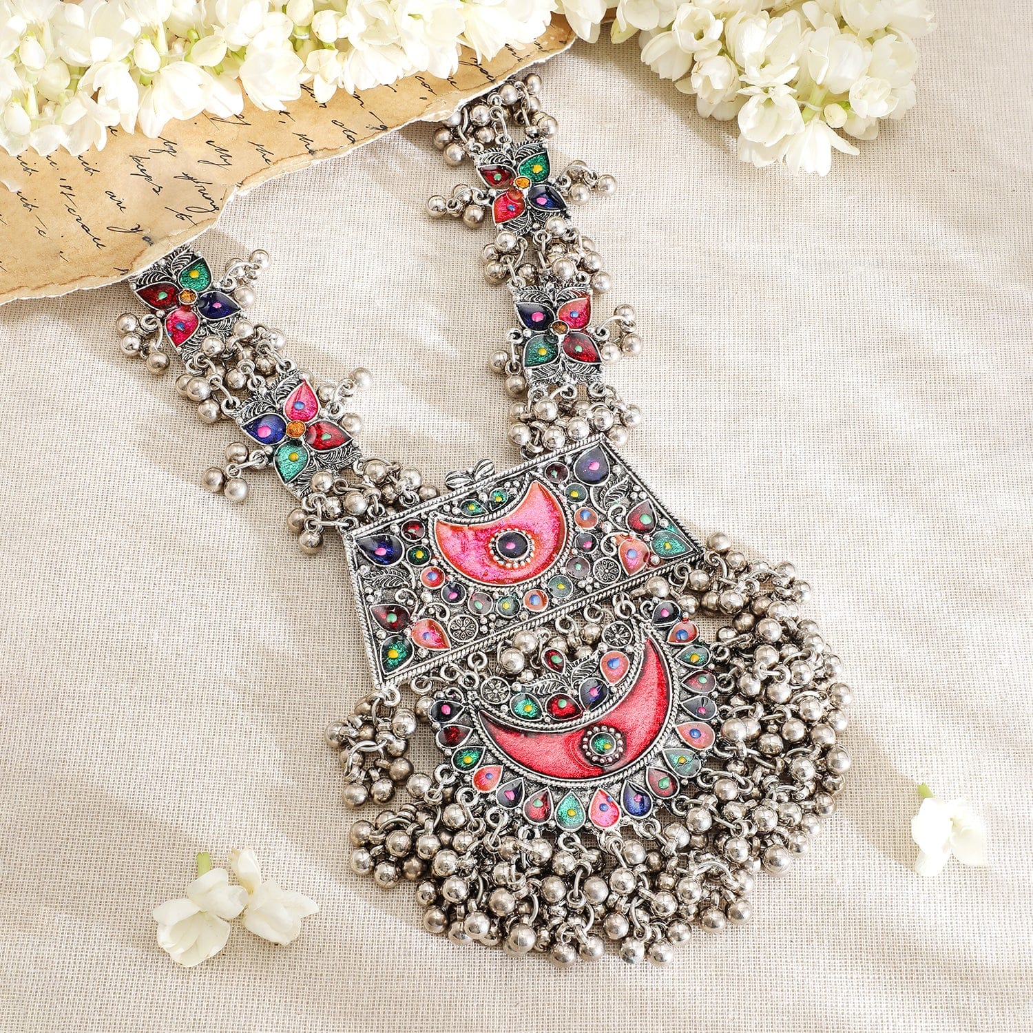 presents an oxidized silver-plated necklace adorned with multicolor enamel work, crescent motifs, silver beads, and ghungroo detailing, perfect for ethnic and festive looks. Occasion : Bring your style to a whole new level with this handcrafted piece of jewelry. When you’re celebrating a special Occasion : – a birthday, wedding, or personal milestone – this piece adds that extra something that makes us feel special and looking our best. Material : & Care Dimension : Length : Necklace : 60 cm ; Width : 7.5 cm Material : Brass Care Label : It is advisable to avoid contact with water and organic chemicals i.e. perfume sprays. Store jewelry in airtight box. After use, wipe the jewelry with soft cotton cloth.