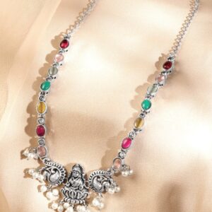 Oxidized silver-plated necklace with multicolor stones, divine Lakshmi motif, and pearl accents—perfect for festive, cultural, and traditional occasions for women. Material & Care Dimension : Necklace : 12 cm ; Width : 4.5 cm Material: Brass Collection : Oxidized Net Weight: 26.61 gram Net Quantity: 1 Necklace Care Label: It is advisable to avoid contact with water and organic chemicals i.e. perfume sprays. Store jewellery in airtight box. After use, wipe the jewellery with soft cotton cloth.