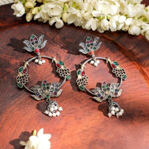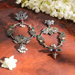 Add a touch of traditional elegance with these oxidized silver-plated hoop earrings. Featuring a vibrant multicolored lotus motif, intricate peacock designs, and dangling pearl beads, these earrings are a perfect blend of cultural artistry and modern style. Occasion : Bring your style to a whole new level with this handcrafted piece of jewelry. When you’re celebrating a special Occasion : – a birthday, festive, wedding, or personal milestone – this piece adds that extra something that makes us feel special and looking our best. Material & Care Dimension : Length: 9.5 cm ; Width : 5.5 cm Material : Brass Weight : 34.82 gram Net Quantity : 1 Pair of Earrings Care Label : It is advisable to avoid contact with water and organic chemicals i.e. perfume sprays. Store jewelry in airtight box. After use, wipe the jewellery with soft cotton cloth.