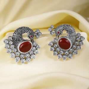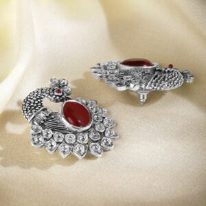 Earrings : These earrings showcase a stunning peacock motif in oxidized silver plating, intricately detailed to reflect traditional elegance. The peacock design is highlighted by deep ruby red stones, adding a rich contrast to the silver. These stud earrings are a perfect blend of classic and vibrant elements, making them a unique statement piece. Occasion : Bring your style to a whole new level with this handcrafted piece of jewellery. When you’re celebrating a special Occasion : – a birthday, wedding, or personal milestone – this piece adds that extra something that makes us feel special and looking our best. Material : & Care Dimension : Size : Length : 4.5 cm, Width : 4.5 cm Material :Brass Care Label : It is advisable to avoid contact with water and organic chemicals i.e. perfume sprays. Store jewellery in airtight box. After use, wipe the jewellery with soft cotton cloth.