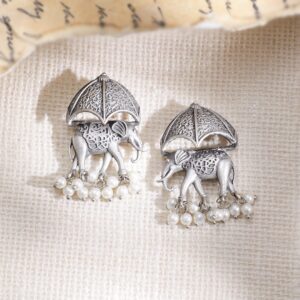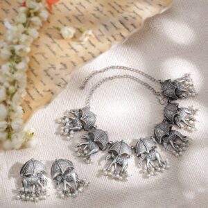 Necklace set: This unique oxidised silver-plated jewelry set features a captivating elephant design, with intricately detailed motifs that highlight traditional artistry. Each elephant pendant in the necklace is adorned with delicate pearl beads, adding elegance and movement to the bold design. The matching earrings mirror the charming elephant motif, creating a cohesive and eye-catching set. Perfect for those who appreciate cultural and artistic jewelry, this set beautifully blends traditional themes with a contemporary edge. Occasion : Bring your style to a whole new level with this handcrafted piece of jewellery. When you’re celebrating a special Occasion : – a birthday, wedding, or personal milestone – this piece adds that extra something that makes us feel special and looking our best. Material : & Care Dimension :Size : Necklace & Earrings : Length : 17/4.5 cm Width : 4/2.5 cm Material : Brass Care Label : It is advisable to avoid contact with water and organic chemicals i.e. perfume sprays. Store jewellery in airtight box. After use, wipe the jewellery with soft cotton cloth.