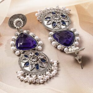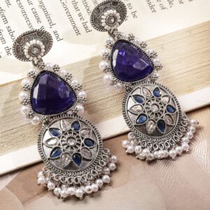 Earrings : These oxidized silver-plated drop earrings feature a bold purple triangle-cut stone, surrounded by white beads and a circular floral motif with blue and white stones. Finished with pearl beaded danglers, this statement pair is ideal for ethnic and festive looks. Styling Tip: A perfect statement earring for festive, traditional, or cultural attire—pairs effortlessly with sarees, lehengas, or Indo-western outfits for women & girls Material & Care Dimension : Length: 8 cm ; Width : 2.5 cm Material : Brass Weight: 62 gram Net Quantity : 1 Pair of Earrings Collection : Oxidized Care Label : It is advisable to avoid contact with water and organic chemicals i.e. perfume sprays. Store jewelry in airtight box. After use, wipe the jewellery with soft cotton cloth.
