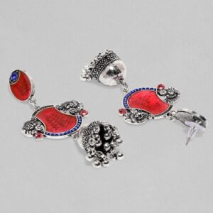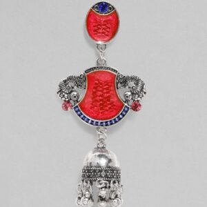 Earrings : These jhumka earrings feature a vibrant red enamel design with intricate peacock motifs, all in oxidized silver plating. The jhumkas are adorned with traditional detailing and add a touch of bold elegance to your ethnic wear, making them a statement accessory for any occasion. Occasion : Bring your style to a whole new level with this handcrafted piece of jewellery. When you’re celebrating a special Occasion : – a birthday, wedding, or personal milestone – this piece adds that extra something that makes us feel special and looking our best. Material : & Care Dimension : Size: Length : 7.5 cm, Width : 3.3 cm Material :Brass Care Label : It is advisable to avoid contact with water and organic chemicals i.e. perfume sprays. Store jewellery in airtight box. After use, wipe the jewellery with soft cotton cloth.