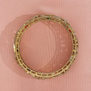 Bangle : Discover elegance with the Gold-Plated design, meticulously crafted for those who cherish luxury. This piece features precious stones for an eye-catching sparkle, making it perfect for special occasions. With a blend of high-quality materials and exquisite design, it promises both durability and style. The versatile look can complement a variety of outfits, adding a touch of sophistication. A must-have for enhancing your accessory collection with timeless elegance. Occasion : Bring your style to a whole new level with this handcrafted piece of jewellery. When you’re celebrating a special Occasion : – a birthday, wedding, or personal milestone – this piece adds that extra something that makes us feel special and looking our best. Material : & Care Dimension : Length : 2.6, Width: 2.6 Material :Brass Care Label : It is advisable to avoid contact with water and organic chemicals i.e. perfume sprays. Store jewellery in airtight box. After use, wipe the jewellery with soft cotton cloth.