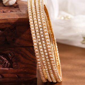 Bangle : Discover the elegance of Pack of 4 18kGold Plated Pearl Beaded Bangles. This piece combines quality craftsmanship with a timeless design, making it perfect for any occasion. Elevate your style effortlessly and enjoy compliments on your refined taste. A must-have addition to your jewelry collection. Occasion : Bring your style to a whole new level with this handcrafted piece of jewellery. When you’re celebrating a special Occasion : – a birthday, wedding, or personal milestone – this piece adds that extra something that makes us feel special and looking our best. Material : & Care Dimension : Bangle Size :Length : 2.4 cm Material :Brass Care Label : It is advisable to avoid contact with water and organic chemicals i.e. perfume sprays. Store jewellery in airtight box. After use, wipe the jewellery with soft cotton cloth.