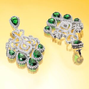 Elevate your elegance with our Premium Rhodium-plated AAA Cubic Zirconia Emerald Green Statement Chandelier Earrings. The exquisite design features brilliant emerald green stones that sparkle with sophistication. Perfect for special occasions, these short-length earrings make a bold and glamorous statement, adding a touch of luxury to any ensemble Occasion : Bring your style to a whole new level with this handcrafted piece of jewellery. When you’re celebrating a special Occasion : – a birthday, wedding, or personal milestone – this piece adds that extra something that makes us feel special and looking our best. Material : & Care Dimension :Length 9 cm Collection : AD Material: Brass Net Weight: 55.28 Gram Net Quantity: 1 Pair of Earrings Care Label: It is advisable to avoid contact with water and organic chemicals i.e. perfume sprays. Store jewellery in airtight box. After use, wipe the jewellery with soft cotton cloth.