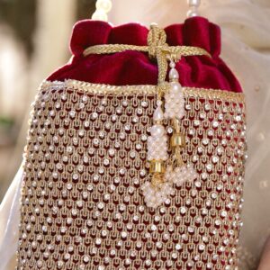 Be the first to review “Red Velvet Potli Bag with Pearl Handle, Golden Embroidery & Stone Detailing”