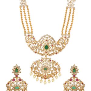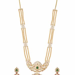 Adorn yourself with the splendor of this temple-inspired necklace set from Accessories. Crafted in captivating gold tone, it features a harmonious arrangement of green, pink, and white stones, creating a breathtaking fusion of colors. This set exudes a sense of grandeur and cultural elegance, making it a statement piece for special occasions and celebrations. Elevate your style with this opulent ensemble that pays homage to tradition while embracing contemporary sophistication. Material : & Care Dimension :Length: 54 cm Material : Brass Care Label : It is advisable to avoid contact with water and organic chemicals i.e. perfume sprays. Store jewellery in airtight box. After use, wipe the jewellery with soft cotton cloth.