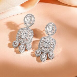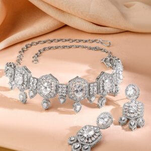 Jewellery Set : This rhodium-plated choker jewellery set features brilliant white AAA cubic zirconia stones in a symmetrical pattern with drop accents. Designed for women, it’s perfect for parties, evening events, and special occasions. Occasion : Bring your style to a whole new level with this handcrafted piece of jewellery. When you’re celebrating a special Occasion : – a birthday, wedding, parties or personal milestone – this piece adds that extra something that makes us feel special and looking our best. Material : & Care Dimension : Length : NS- 19 cm ; E- 3 cm, Width: NS- 4.5 cm ; E- 1.5 cm Net Quantity : 1 Necklace & 1 Pair of Earrings Net Weight: 46.78 Gram Material : Brass Care Label : It is advisable to avoid contact with water and organic chemicals i.e. perfume sprays. Store jewellery in airtight box. After use, wipe the jewellery with soft cotton cloth.