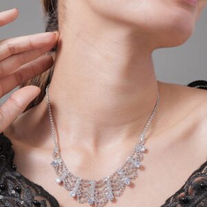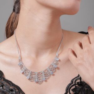 Necklace and Chains : This Rhodium Plated AD & Cubic Zirconia Studded Luxurious Draped Necklace features an elegant draped design that creates a cascading effect, enhancing the overall opulence of the piece. The necklace is meticulously adorned with brilliant cubic zirconia stones, ensuring a dazzling sparkle with every movement. The rhodium plating offers long-lasting shine and resistance to tarnish, making this necklace a perfect choice for those who seek both luxury and durability. Ideal for special events, this necklace will elevate any ensemble with its sophisticated and graceful design. Occasion : Bring your style to a whole new level with this handcrafted piece of jewellery. When you’re celebrating a special Occasion : – a birthday, wedding, or personal milestone – this piece adds that extra something that makes us feel special and looking our best. Material : & Care Dimension : Size : Length : 19 cm, Width : 2.5 cm Material :Brass Care Label : It is advisable to avoid contact with water and organic chemicals i.e. perfume sprays. Store jewellery in airtight box. After use, wipe the jewellery with soft cotton cloth.