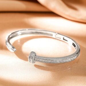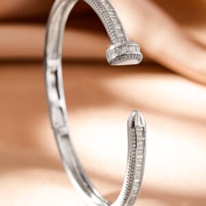 Bracelet :Elevate your style with ‘ Rhodium-Plated Cuff Bracelet, adorned with baguette-cut cubic zirconia stones. The openable design ensures a comfortable fit, making it a versatile and elegant choice for any ensemble. Occasion : Bring your style to a whole new level with this handcrafted piece of jewellery. When you’re celebrating a special Occasion : – a birthday, wedding, or personal milestone – this piece adds that extra something that makes us feel special and looking our best. Material : & Care Dimension : Length : 6.5 cm, Width: 1 cm Net Weight: 16.55 g Net Quantity : 1 Bracelet Material :Brass Care Label : It is advisable to avoid contact with water and organic chemicals i.e. perfume sprays. Store jewellery in airtight box. After use, wipe the jewellery with soft cotton cloth.