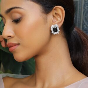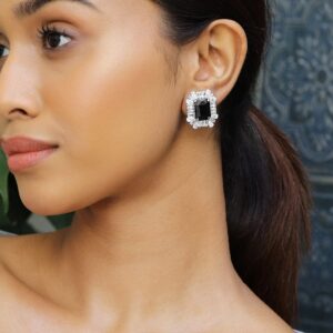 Earrings : Make a bold statement with these rhodium-plated stud earrings, featuring a striking black onyx centerpiece surrounded by dazzling cubic zirconia, perfect for elevating your style. Occasion : Bring your style to a whole new level with this handcrafted piece of jewellery. When you’re celebrating a special Occasion : – a birthday, wedding, or personal milestone – this piece adds that extra something that makes us feel special and looking our best. Material : & Care Dimension : Length : 2.5 cm, Width: 2 cm Net Weight: 9.4 g Net Quantity : 1 Pair Of Earrings Material :Brass Care Label : It is advisable to avoid contact with water and organic chemicals i.e. perfume sprays. Store jewellery in airtight box. After use, wipe the jewellery with soft cotton cloth.