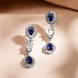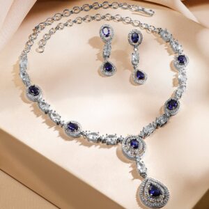 Jewelry Set : A rhodium-plated luxe statement necklace set, featuring blue sapphire and AAA cubic zirconia in an elegant halo and teardrop design. Ideal for weddings, grand celebrations & special occasions. Occasion : Bring your style to a whole new level with this handcrafted piece of jewellery. When you’re celebrating a special Occasion : – a birthday, wedding, festive or personal milestone – this piece adds that extra something that makes us feel special and looking our best. Material & Care Dimension : Length : Necklace : 16 cm, Earrings : 4 cm Dimension : Width : Necklace : 2 cm, Earrings : 1 cm Net Weight : 34.74 Gram Net Quantity : 1 Necklace & 1 Pair of Earrings Material : Brass Care Label : It is advisable to avoid contact with water and organic chemicals i.e. perfume sprays. Store jewellery in airtight box. After use, wipe the jewellery with soft cotton cloth.
