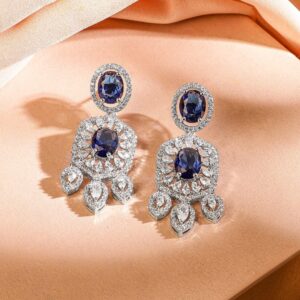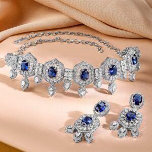 Jewellery Set : This rhodium-plated choker set features luxe blue sapphire-toned stones surrounded by AAA cubic zirconia and delicate drop accents. A glamorous statement jewellery set for women, perfect for parties and special occasions. Occasion : Bring your style to a whole new level with this handcrafted piece of jewellery. When you’re celebrating a special Occasion : – a birthday, wedding, parties or personal milestone – this piece adds that extra something that makes us feel special and looking our best. Material : & Care Dimension : Length : NS- 19 cm ; E- 3 cm, Width: NS- 4.5 cm ; E- 1.5 cm Net Quantity : 1 Necklace & 1 Pair of Earrings Net Weight: 46.78 Gram Material : Brass Care Label : It is advisable to avoid contact with water and organic chemicals i.e. perfume sprays. Store jewellery in airtight box. After use, wipe the jewellery with soft cotton cloth.