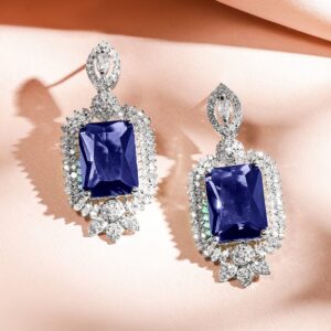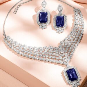 Jewelry Set : This rhodium-plated necklace set features a deep blue sapphire rectangular stone centerpiece with a cascading V-shaped layout of white cubic zirconia – ideal for weddings and grand occasions. Occasion : Bring your style to a whole new level with this handcrafted piece of jewellery. When you’re celebrating a special Occasion : – a birthday, wedding, festive or personal milestone – this piece adds that extra something that makes us feel special and looking our best. Material & Care Dimension : Length : Necklace : 14 cm, Earrings : 5 cm Dimension : Width : Necklace : 2.5 cm, Earrings : 2 cm Net Weight : 55.87 Gram Net Quantity : 1 Necklace & 1 Pair of Earrings Material : Brass Care Label : It is advisable to avoid contact with water and organic chemicals i.e. perfume sprays. Store jewellery in airtight box. After use, wipe the jewellery with soft cotton cloth.