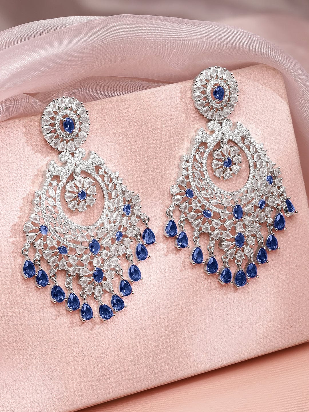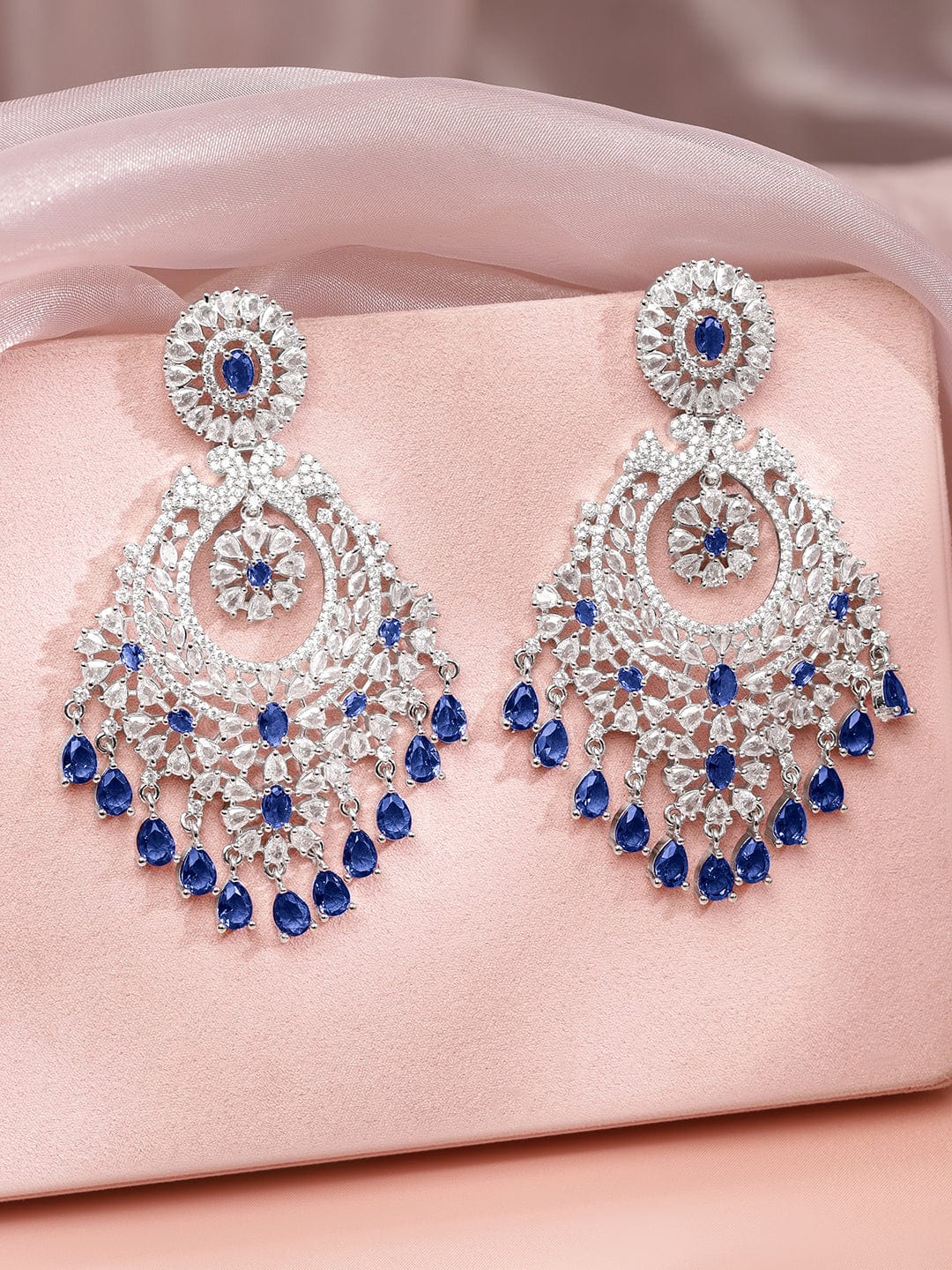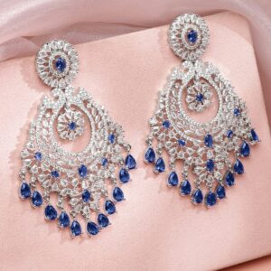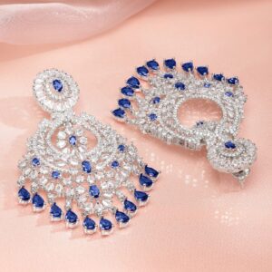 Earrings : These rhodium-plated chandelier earrings feature cascading blue sapphire teardrops and dazzling white cubic zirconia—an opulent accessory for women & girls to shine at parties and special occasions. Occasion : Bring your style to a whole new level with this handcrafted piece of jewellery. When you’re celebrating a special Occasion : – a birthday, wedding, parties or personal milestone – this piece adds that extra something that makes us feel special and looking our best. Material : & Care Dimension : Length : 9 cm , Width: 5.5 cm Net Weight: 59.43 Gram Net Quantity : 1 Pair Of Earrings Material : Brass Care Label : It is advisable to avoid contact with water and organic chemicals i.e. perfume sprays. Store jewellery in airtight box. After use, wipe the jewellery with soft cotton cloth.