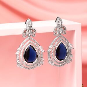 Earrings : These Rhodium-Plated drop earrings feature a teardrop design with a bold blue sapphire center and shimmering white cubic zirconia. A perfect match for festive outfits, parties & special occasions. Occasion : Bring your style to a whole new level with this handcrafted piece of jewellery. When you’re celebrating a special Occasion : – a birthday, wedding, festive or personal milestone – this piece adds that extra something that makes us feel special and looking our best. Material & Care Dimension : Length : 5 cm, Width: 3 cm Net Weight: 19.80 g Net Quantity : 1 Pair Of Earrings Material :Brass Care Label : It is advisable to avoid contact with water and organic chemicals i.e. perfume sprays. Store jewellery in airtight box. After use, wipe the jewellery with soft cotton cloth.