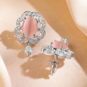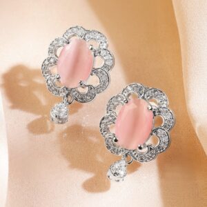 Earrings : These rhodium-plated earrings feature a blush pink stone with floral Cubic Zirconia frame and drop—perfect for elegant styling at parties, festive events, and special traditional occasions. Occasion Ready Styling: Ideal for weddings, evening parties, and festive gatherings, these earrings complement sarees, gowns, and Indo-western wear with timeless sophistication and sparkle. Material : & Care Dimension : Length : 2.5 cm ; Width: 2 cm Net Weight: 9.44 Gram Net Quantity : 1 Pair Of Earrings Material : Brass Care Label : It is advisable to avoid contact with water and organic chemicals i.e. perfume sprays. Store jewellery in airtight box. After use, wipe the jewellery with soft cotton cloth.