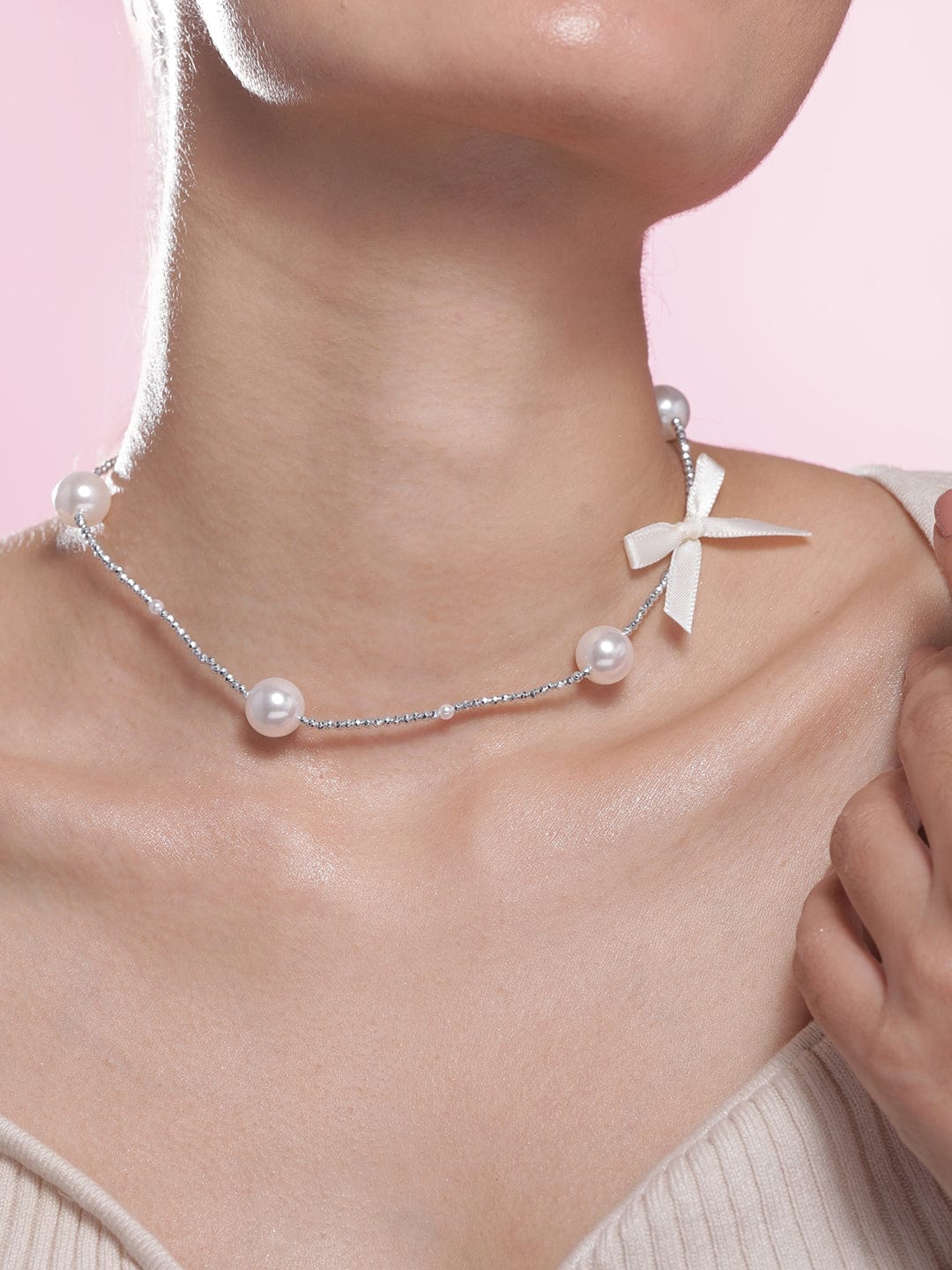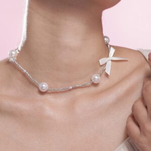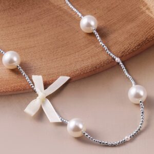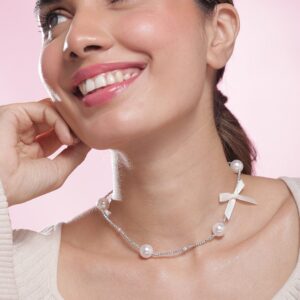 Necklace and Chains : This elegant necklace features a rhodium-plated chain adorned with lustrous faux pearls and a delicate fabric ribbon bow. The combination of metallic shine and soft ribbon creates a chic and sophisticated look, perfect for adding a touch of charm to any outfit. Occasion : Bring your style to a whole new level with this handcrafted piece of jewellery. When you’re celebrating a special Occasion : – a birthday, wedding, or personal milestone – this piece adds that extra something that makes us feel special and looking our best. Material : & Care Dimension : Size : Length : 18 cm, Width : 10 cm Material :Alloy Weight : 7.03g Net Qnty : 1 Necklace Care Label : It is advisable to avoid contact with water and organic chemicals i.e. perfume sprays. Store jewellery in airtight box. After use, wipe the jewellery with soft cotton cloth.