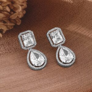Earrings : Discover the elegance of Rhodium Plated Crystal AD & Cubic Zirconia Studded Drop Earrings – Elegant Design. This piece combines quality craftsmanship with a timeless design, making it perfect for any occasion. Elevate your style effortlessly and enjoy compliments on your refined taste. A must-have addition to your jewelry collection. Occasion : Bring your style to a whole new level with this handcrafted piece of jewellery. When you’re celebrating a special Occasion : – a birthday, wedding, or personal milestone – this piece adds that extra something that makes us feel special and looking our best. Material : & Care Dimension : Earrings Size :Length : 1.2 cm, Width : 1.2 cm Material :Brass Care Label : It is advisable to avoid contact with water and organic chemicals i.e. perfume sprays. Store jewellery in airtight box. After use, wipe the jewellery with soft cotton cloth.