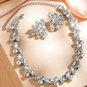Necklace Set : This rhodium-plated statement necklace set features brilliant-cut cubic zirconia and crystal AD stones in an elegant design. A glamorous choice for parties, evening events, and special occasions. Occasion : Bring your style to a whole new level with this handcrafted piece of jewellery. When you’re celebrating a special Occasion : – a birthday, wedding, or personal milestone – this piece adds that extra something that makes us feel special and looking our best. Material : & Care Dimension : Length : NS- 18 ; E- 4 cm, Width: NS- 3.5; E- 3.5 W Net Weight: 66.14 g Net Quantity : 1 Necklace & 2 Earrings Material :Brass Care Label : It is advisable to avoid contact with water and organic chemicals i.e. perfume sprays. Store jewellery in airtight box. After use, wipe the jewellery with soft cotton cloth.