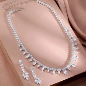 Jewellery Set : This exquisite piece, ‘ Rhodium-Plated Crystal-Studded Jewellery Set’, is a perfect blend of elegance and craftsmanship. Designed to captivate, it reflects timeless beauty and intricate detailing. Ideal for special occasions, this accessory adds a touch of sophistication to your look. Made with high-quality materials, it guarantees durability and comfort. Elevate your style with this stunning creation, making you stand out effortlessly. Occasion : Bring your style to a whole new level with this handcrafted piece of jewellery. When you’re celebrating a special Occasion : – a birthday, wedding, or personal milestone – this piece adds that extra something that makes us feel special and looking our best. Material : & Care Dimension : Length : 20 cm / 2 cm, Width: 3 cm /1 cm Material : Brass Weight : 75 g Net Qnty : 1 Necklace, 1 Pair of Earrings Care Label : It is advisable to avoid contact with water and organic chemicals i.e. perfume sprays. Store jewellery in airtight box. After use, wipe the jewellery with soft cotton cloth.