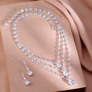 Jewellery Set : This exquisite piece, ‘ Rhodium Plated Crystal-Studded Layered Jewellery Set’, is a perfect blend of elegance and craftsmanship. Designed to captivate, it reflects timeless beauty and intricate detailing. Ideal for special occasions, this accessory adds a touch of sophistication to your look. Made with high-quality materials, it guarantees durability and comfort. Elevate your style with this stunning creation, making you stand out effortlessly. Occasion : Bring your style to a whole new level with this handcrafted piece of jewellery. When you’re celebrating a special Occasion : – a birthday, wedding, or personal milestone – this piece adds that extra something that makes us feel special and looking our best. Material : & Care Dimension : Length : 25 cm / 3 cm, Width: 2.5 cm / 0.9 cm Material : Brass Weight : 75 g Net Qnty : 1 Necklace, 1 Pair of Earrings Care Label : It is advisable to avoid contact with water and organic chemicals i.e. perfume sprays. Store jewellery in airtight box. After use, wipe the jewellery with soft cotton cloth.
