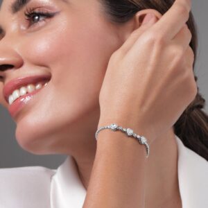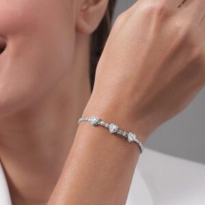 Bracelet : This elegant bracelet features a rhodium-plated chain adorned with sparkling cubic zirconia stones, highlighted by three heart-shaped charms at the center. The adjustable chain ensures a comfortable fit, making it a timeless accessory for any look. Occasion : Bring your style to a whole new level with this handcrafted piece of jewellery. When you’re celebrating a special Occasion : – a birthday, wedding, or personal milestone – this piece adds that extra something that makes us feel special and looking our best. Material : & Care Dimension : Size : Length : 13 cm, Width : 0.6 cm Material :Brass Care Label : It is advisable to avoid contact with water and organic chemicals i.e. perfume sprays. Store jewellery in airtight box. After use, wipe the jewellery with soft cotton cloth.