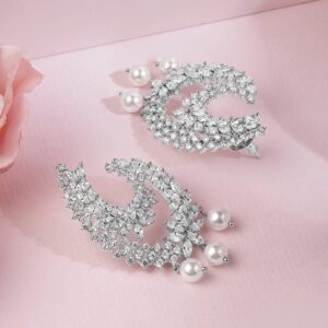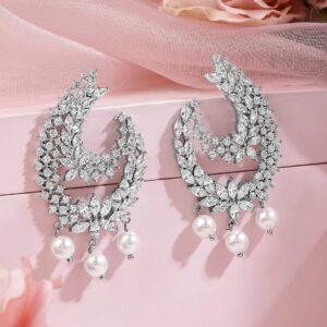 Exquisite rhodium-plated crescent earrings adorned with shimmering cubic zirconia and elegant pearl drops, perfect for a premium and glamorous look. Material & Care Dimension : Length : 5 cm ; Width : 3 cm Material: Brass Net Weight: 18.27 Gram Net Quantity: 1 Pair of Earrings Care Label: It is advisable to avoid contact with water and organic chemicals i.e. perfume sprays. Store jewellery in airtight box. After use, wipe the jewellery with soft cotton cloth.