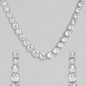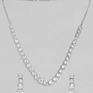 From minimalist to statement, our necklaces are multifaceted, always fashionable, and add a splash of personality to any wardrobe. Occasion : Bring your style to a whole new level with this handcrafted piece of jewellery. When you’re celebrating a special Occasion : – a birthday, wedding, or personal milestone – this piece adds that extra something that makes us feel special and looking our best. Material & Care Dimension : Necklace – 40 cm ,Earrings – 3.3 cm Collection : AD(Silver) Material: Brass Net Weight: 27.61 Gram Net Quantity: 1 Necklace & 1 Pair of Earrings Care Label: It is advisable to avoid contact with water and organic chemicals i.e. perfume sprays. Store jewellery in airtight box. After use, wipe the jewellery with soft cotton cloth.