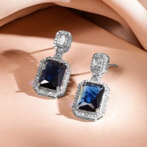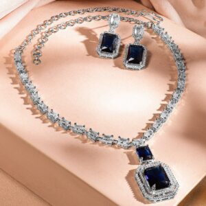 This exquisite rhodium-plated jewellery set features a stunning dark blue sapphire stone surrounded by shimmering white cubic zirconia. The elegant necklace and matching earrings offer a luxurious and timeless look, perfect for premium occasions. Occasion : Bring your style to a whole new level with this handcrafted piece of jewellery. When you’re celebrating a special Occasion : – a birthday, wedding, festive or personal milestone – this piece adds that extra something that makes us feel special and looking our best. Material : & Care Dimension : Length : Neckace : 16 cm, Earrings : 3.3 cm Net Weight: 72 g Net Quantity : 1 Necklace & 1 Pair of Earrings Material : Brass Care Label : It is advisable to avoid contact with water and organic chemicals i.e. perfume sprays. Store jewellery in airtight box. After use, wipe the jewellery with soft cotton cloth.