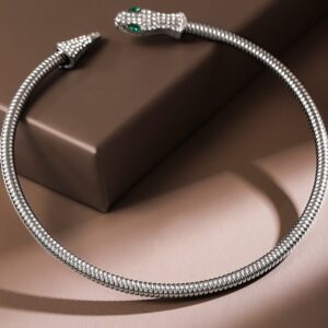 Be the first to review “Rhodium Plated Demi Fine Snake Motif Statement Choker with White & Emerald Stones – Silver”