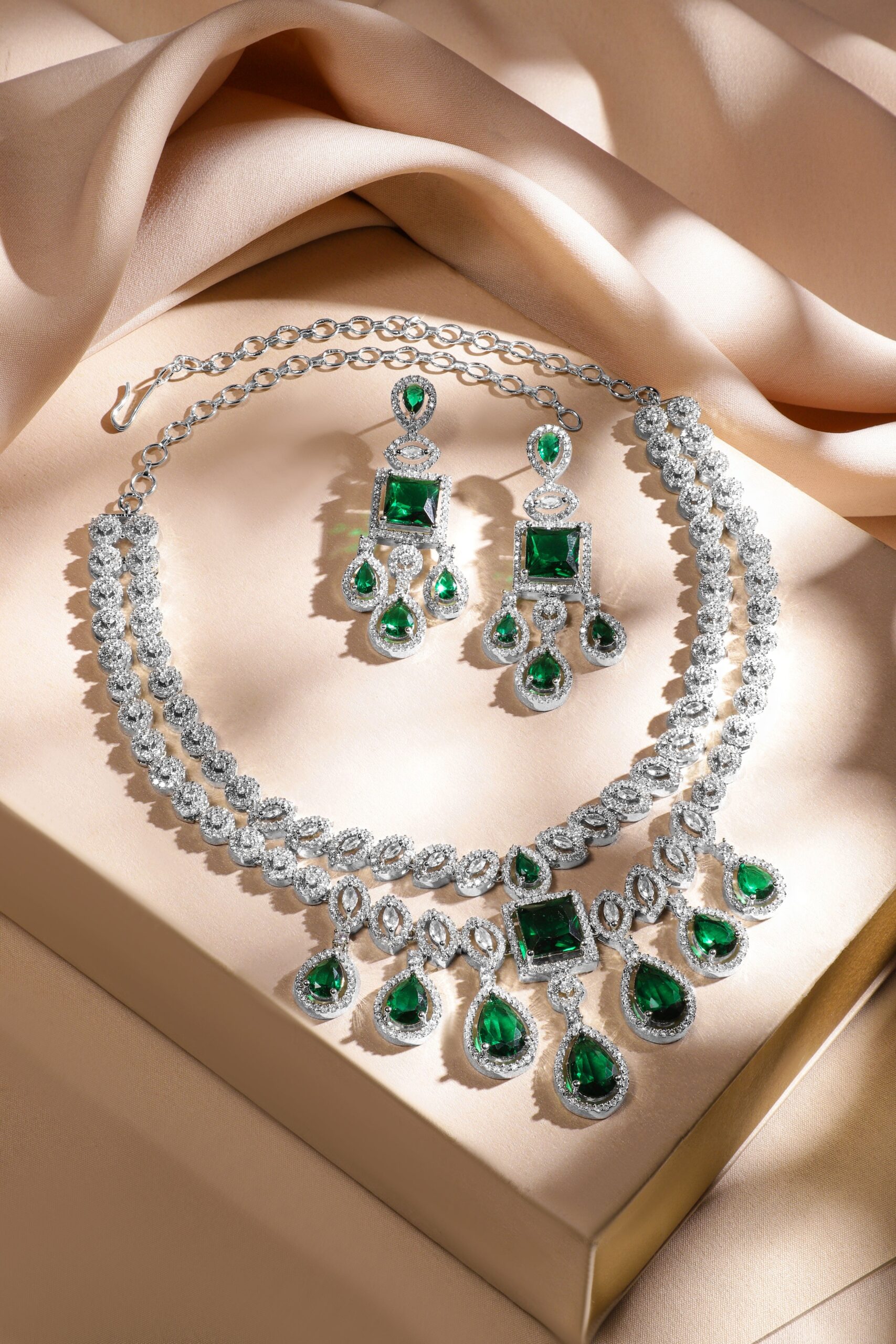 Jewellery Set : A rhodium-plated luxe statement jewellery set, adorned with emerald green stones and AAA cubic zirconia in a silver-tone finish. Ideal for weddings, grand celebrations & special occasions. Occasion : Bring your style to a whole new level with this handcrafted piece of jewellery. When you’re celebrating a special Occasion : – a birthday, wedding, festive or personal milestone – this piece adds that extra something that makes us feel special and looking our best. Material & Care Dimension : Length : Necklace : 15 cm, Earrings : 8 cm Dimension : Width : Necklace : 6 cm, Earrings : 1.5 cm Net Weight : 78.30 Gram Net Quantity : 1 Necklace & 1 Pair of Earrings Material : Brass Care Label : It is advisable to avoid contact with water and organic chemicals i.e. perfume sprays. Store jewellery in airtight box. After use, wipe the jewellery with soft cotton cloth.