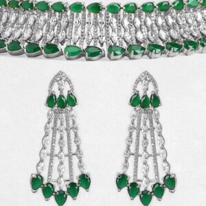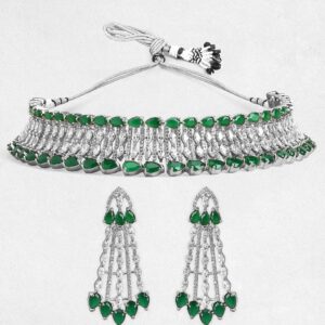 Jewellery Set : Discover the elegance of Rhodium-Plated Emerald Green & White Cubic Zirconia Studded Choker Necklace Set. This piece combines quality craftsmanship with a timeless design, making it perfect for any occasion. Elevate your style effortlessly and enjoy compliments on your refined taste. A must-have addition to your jewelry collection. Occasion : Bring your style to a whole new level with this handcrafted piece of jewellery. When you’re celebrating a special Occasion : – a birthday, wedding, or personal milestone – this piece adds that extra something that makes us feel special and looking our best. Material : & Care Dimension : Necklace Size : 18 cm / 2.2 cm, Earrings Size : 5.8 cm / 2.5 cm Material: Brass Net Weight: 67.02 Gram Net Quantity: 1 Necklace & 1 Pair of Earrings Care Label: It is advisable to avoid contact with water and organic chemicals i.e. perfume sprays. Store jewellery in airtight box. After use, wipe the jewellery with soft cotton cloth.